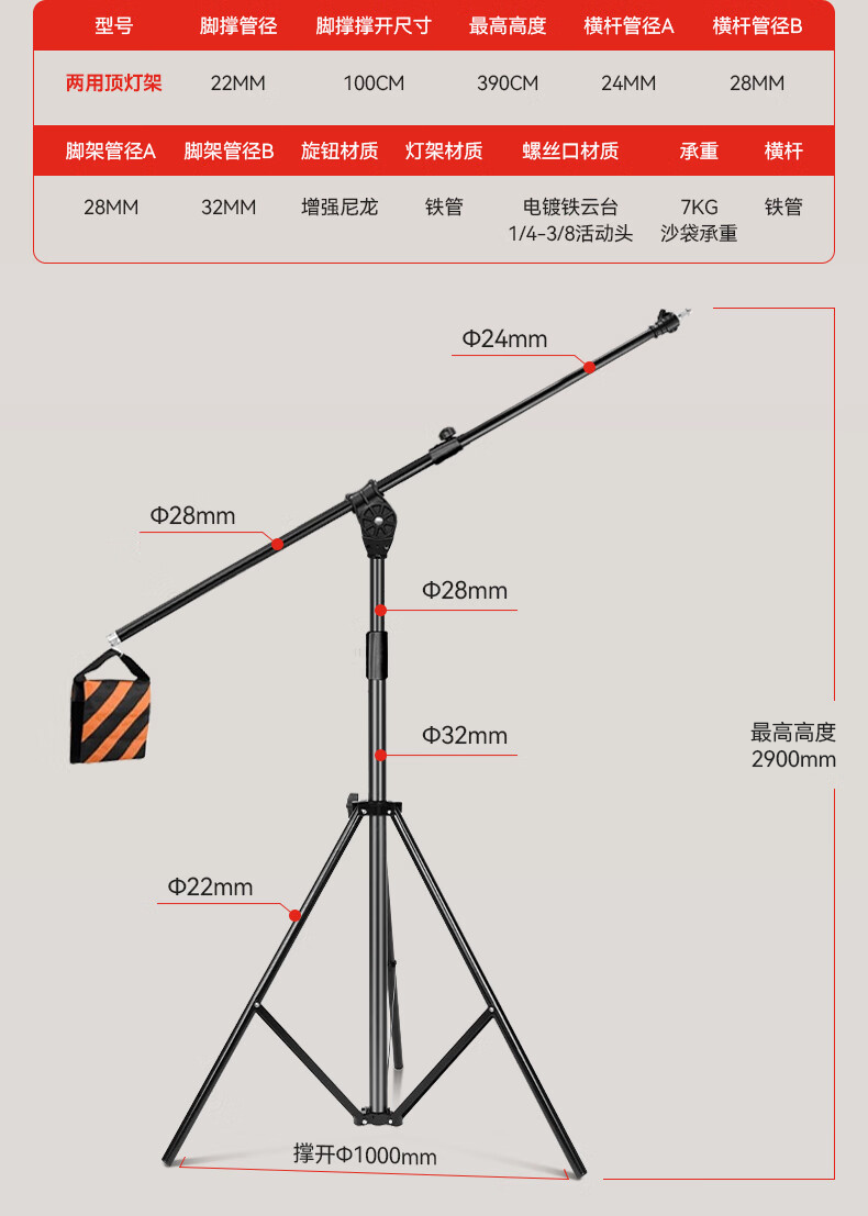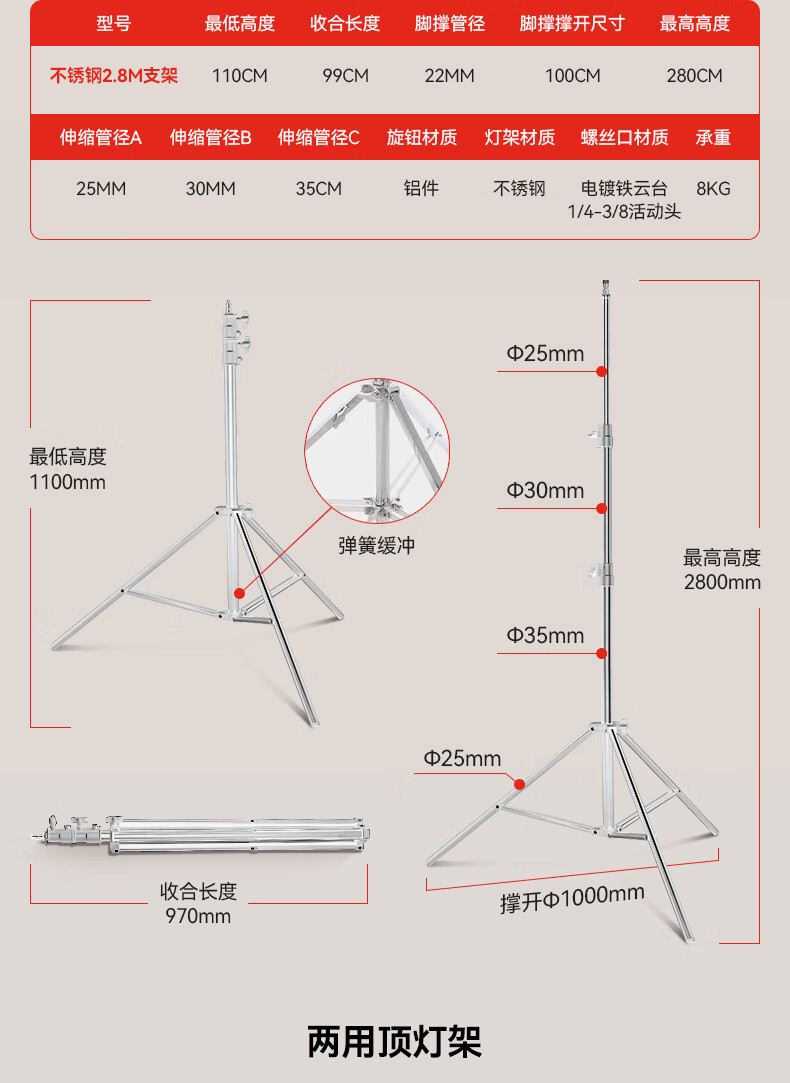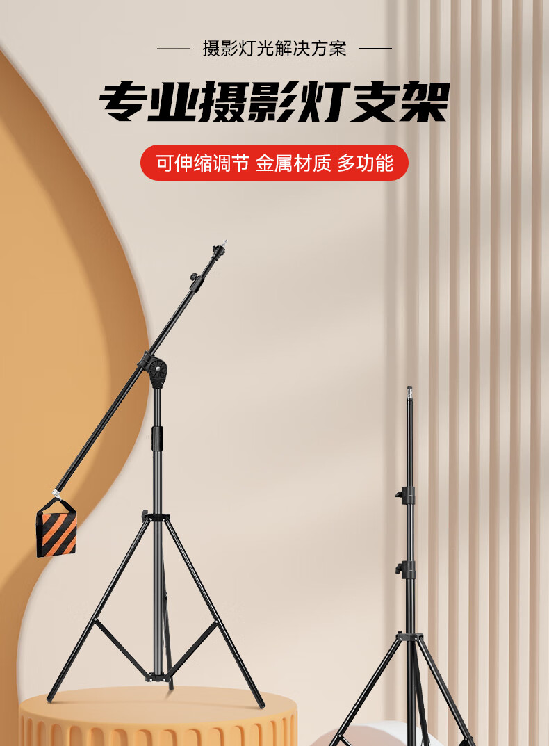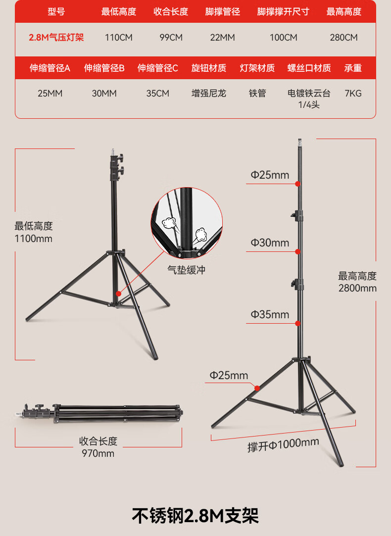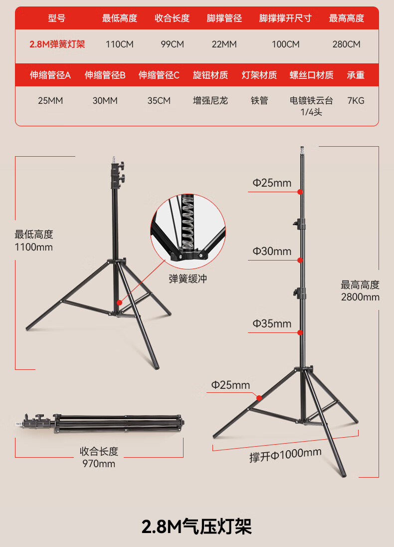 神牛LED摄影灯支架2.8米便携闪光灯影室灯补光灯外拍灯影棚视频直播三脚灯架 2.8m弹簧灯架 标配